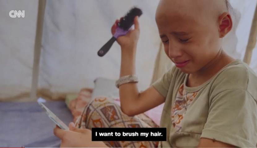 在CNN的鏡頭下,薩瑪手拿刷子對着一塊破碎的鏡子做着梳頭的動作,然後哭了出來。“我真的很傷心,我的梳子沒有一根頭髮可梳……我真的很想再梳一次頭髮。”