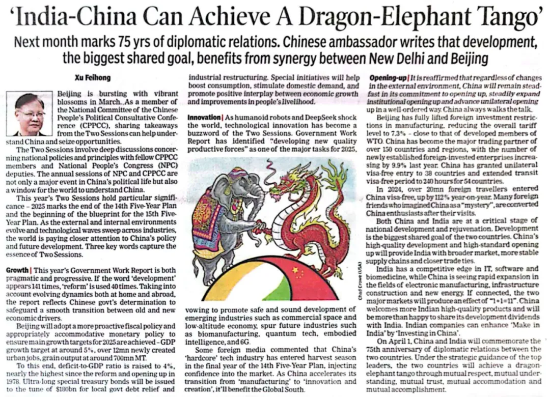 據微信公眾號“中國駐印度大使館”消息,3月19日,駐印度大使徐飛洪在印度主流英文報紙《印度時報》發表題為《中國和印度可以實現龍象共舞》的署名文章。