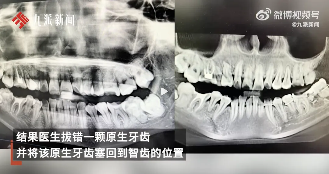 近日,一位網友發文稱自己34歲的妹妹在安徽安慶市立醫院口腔科門診拔智齒,結果醫生拔錯一顆原生牙齒,並將該原生牙齒塞回到智齒的位置。