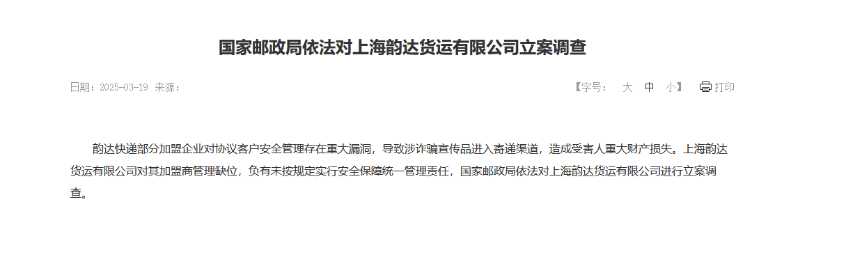 國家郵政局依法對上海韻達貨運有限公司立案調查