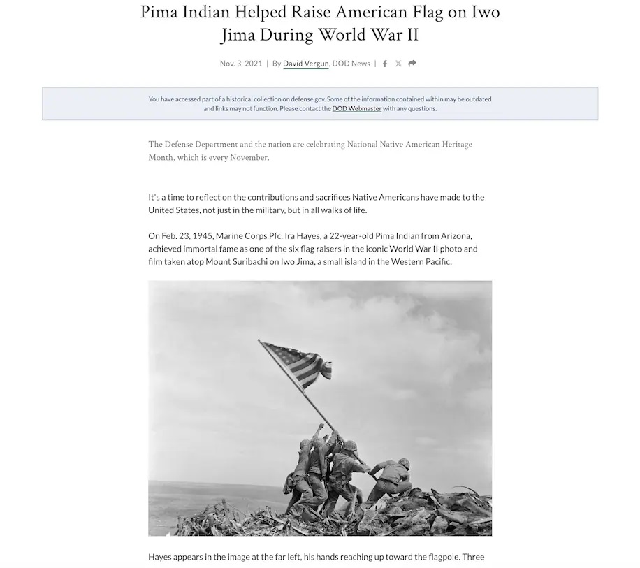 五角大樓網站將這張照片列入“標誌性圖像”,還專門用一個頁面介紹了海耶斯,使其成為“美洲原住民對美國的貢獻和犧牲”的象徵之一。