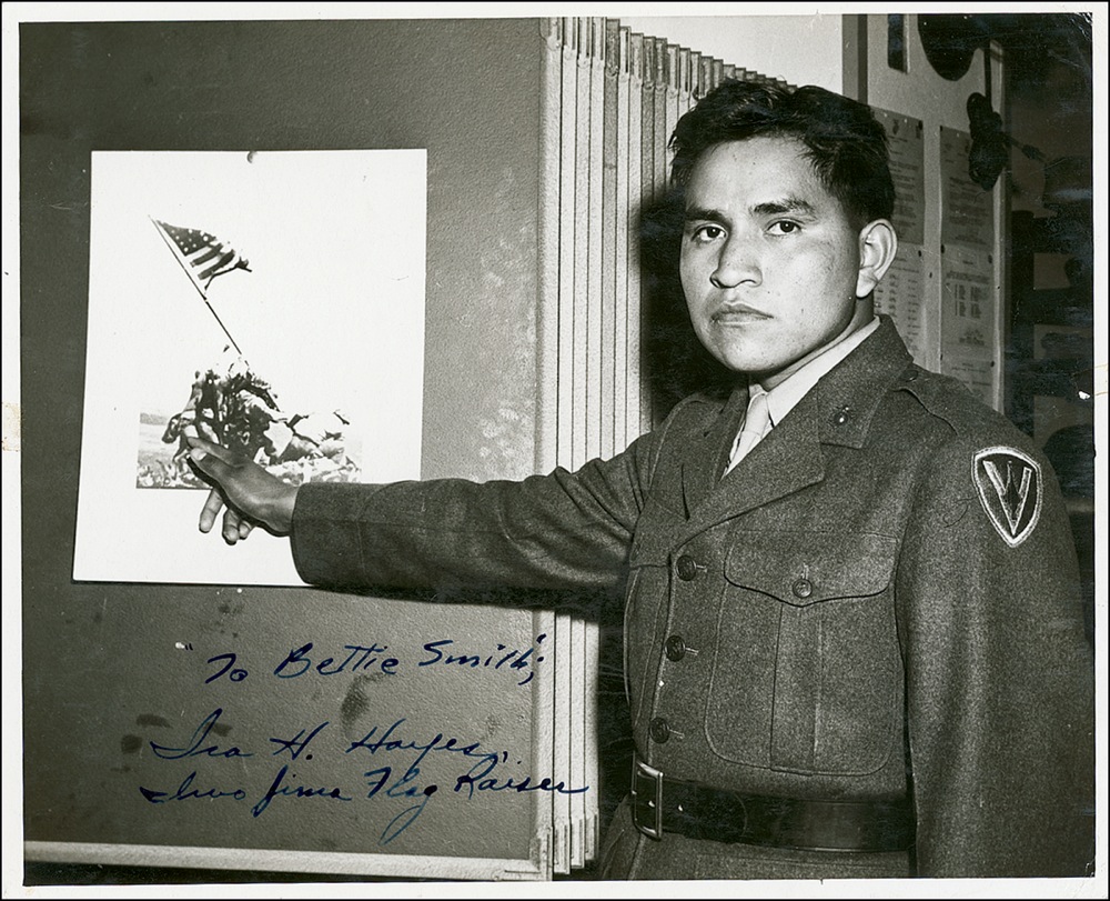 在升起旗幟的六名美軍士兵中,照片最左側的艾拉·海耶斯(Ira Hayes)是北美原住民皮馬人。《華盛頓郵報》稱,由於羅森塔爾的照片廣受好評,五角大樓派出海耶斯等人在美國巡迴以推銷戰爭債券,後世多部關於硫磺島戰役的電影也重點刻畫了海耶斯。