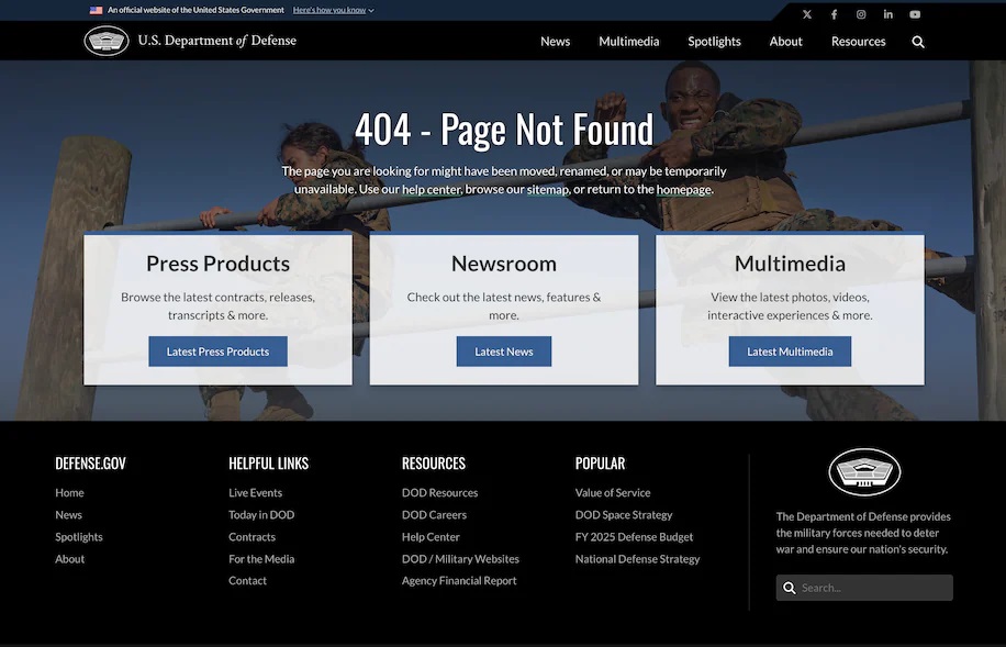 報道稱,被刪除的網頁現在都被重定向到一個錯誤頁面,五角大樓還在這些網頁的原始URL中加入了“dei”三個字母。