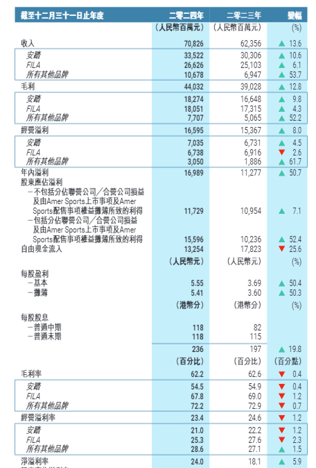 截至2024年,安踏體育收入首次突破700億元,同比增長13.6%至708.26億元;淨利潤同比增長52.4%達到155.96億元。加上旗下亞瑪芬體育2024年實現的372.60億元收入,安踏體育疊加亞瑪芬體育的營收之和首次突破了千億元大關,達到了1080.86億元。