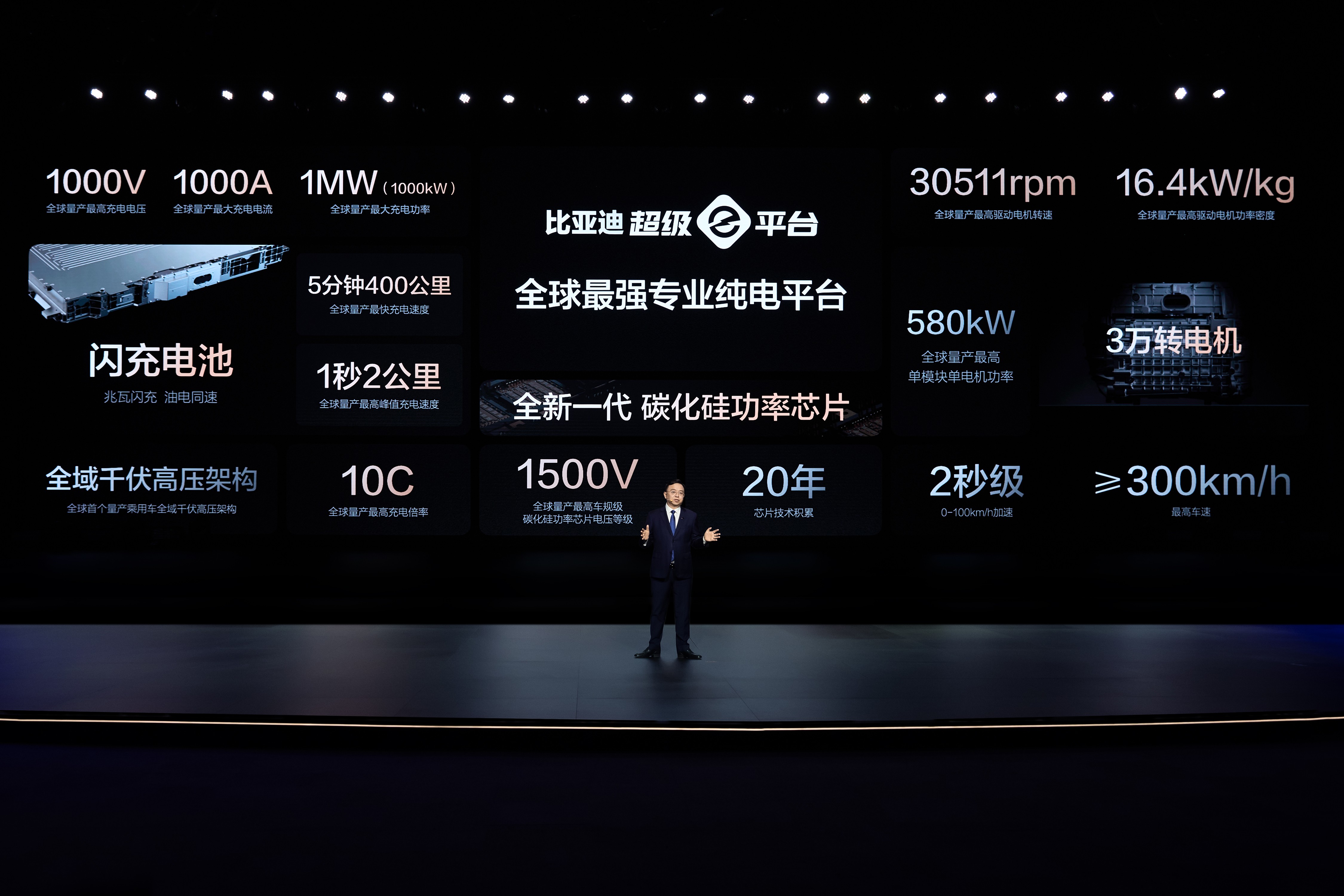 在新平台上,比亞迪推出了全球首個電動車全域1000V整車架構,能夠實現1兆瓦(1000kW)的充電功率,最快速度實現充電5分鐘續航400公里。