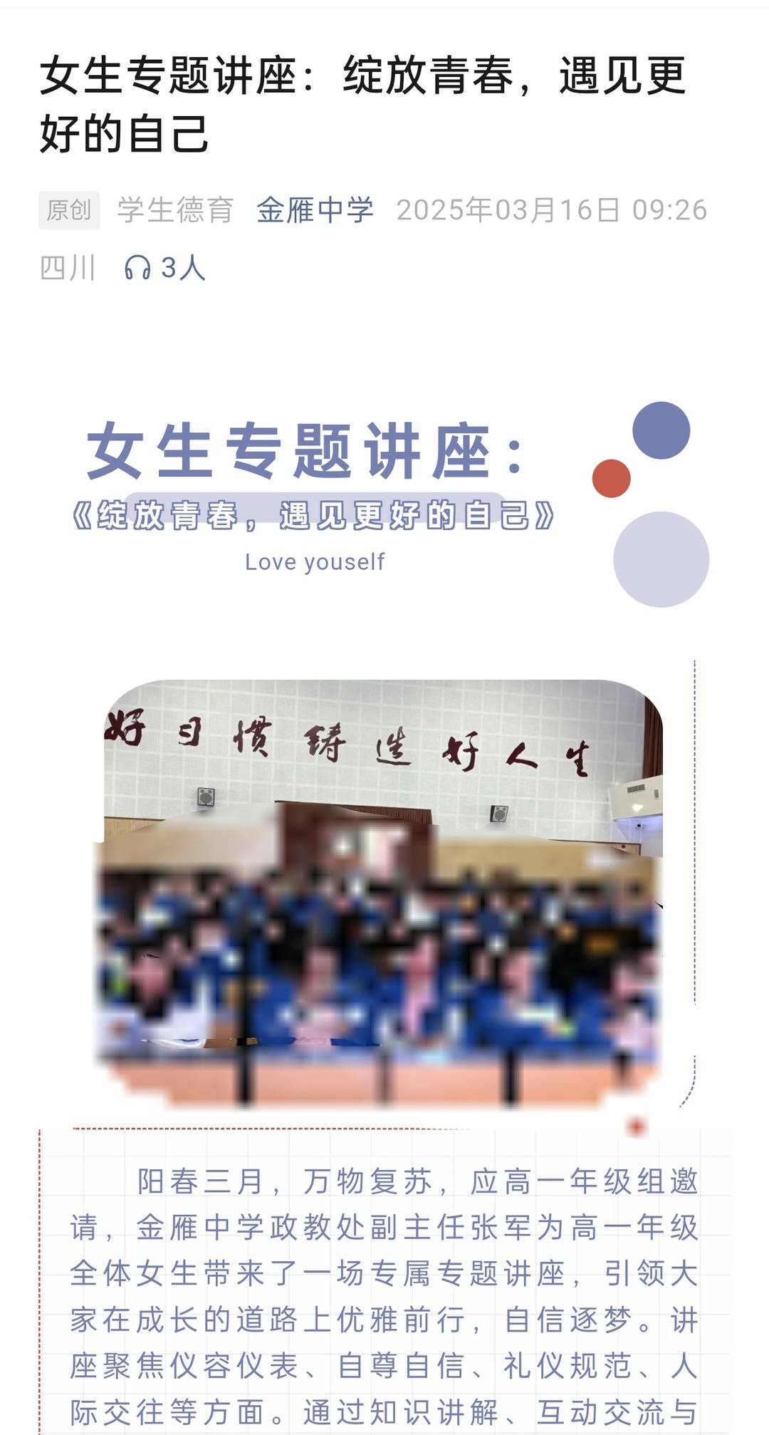 記者從金雁中學的官方微信號看到,3月16日該學校推送了一篇名為《女生專題講座:綻放青春,遇見更好的自己》的文章,該校政教處副主任為高一年級全體女生帶來了一場專屬專題講座,講座聚焦儀容儀表、自尊自信、禮儀規範、人際交往等方面。