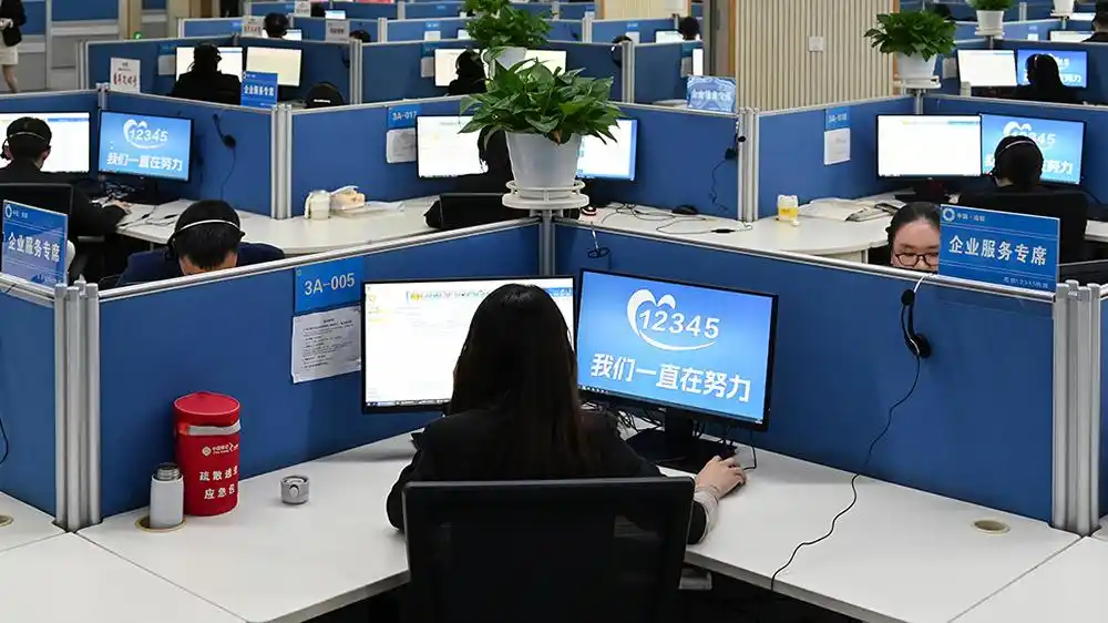 24小時“不打烊”的12345話務大廳,電話響鈴聲、對話聲、鍵盤敲擊聲此起彼伏,牆上的電子屏滾動着即時工單數據。