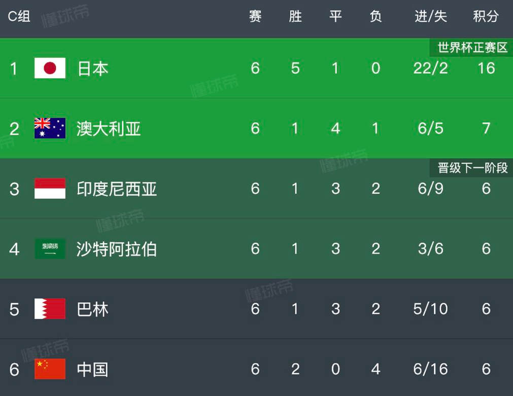 目前18強賽C組積分榜上,日本隊積16分領跑,澳大利亞隊積7分排名第二,中國隊與沙特、巴林和印度尼西亞隊同積6分。