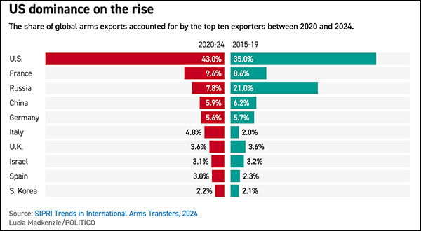 2020年至2024年(左)與2015年至2019年(右)全球軍火商份額佔比對比圖 “政客”新聞網歐洲版(Politico EU)製圖
