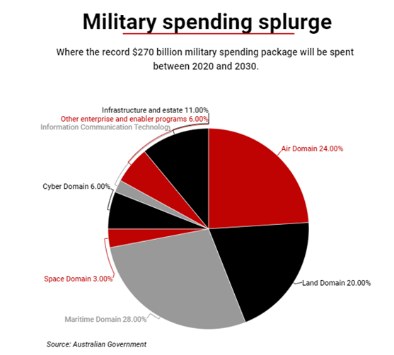 在2020年的國防政策講話中,時任澳大利亞總理莫里森承諾,要在未來10年內(2020-2030)投入2700億澳元(約合1.3萬億元人民幣)用於國防能力建設。其中的28%要用在海洋領域。