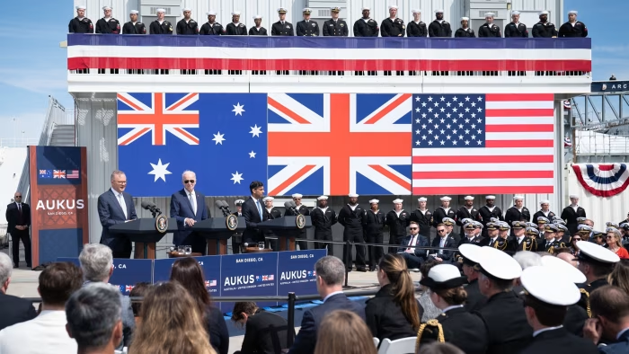 2023年4月,澳大利亞總理安東尼·阿爾巴尼斯、美國總統喬·拜登和英國首相里希·蘇納克在聖地亞哥的美國海軍基地宣佈AUKUS潛艇協議。金融時報
