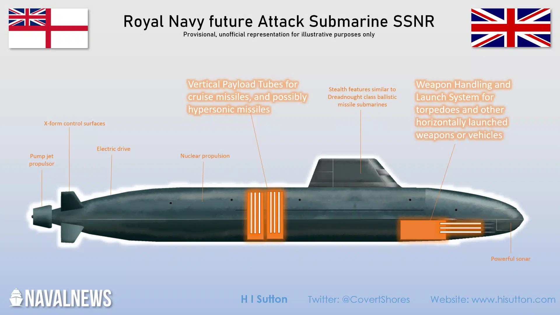 SSNR將是第一代具有垂髮的英國核潛艇。英國核潛艇一直有從魚雷管發射“戰斧”巡航導彈的能力,但美國即將停產魚雷管發射的“戰斧”,全部改為垂髮“戰斧”,迫使SSNR增加垂髮管艙段。