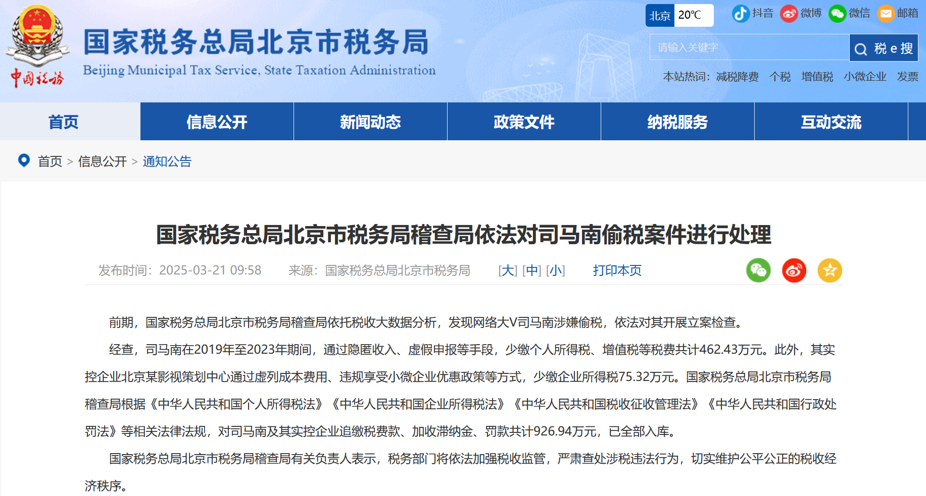 3月21日,國家税務總局北京市税務局稽查局公佈司馬南偷税案件處理情況。