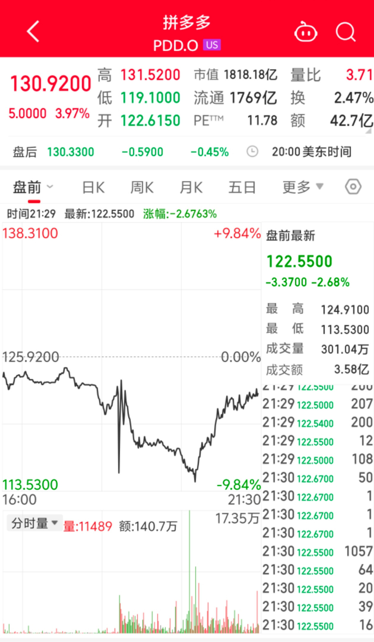 昨夜美股收盤,拼多多漲3.97%,報130.92美元/每股,市值為1818.18億美元。