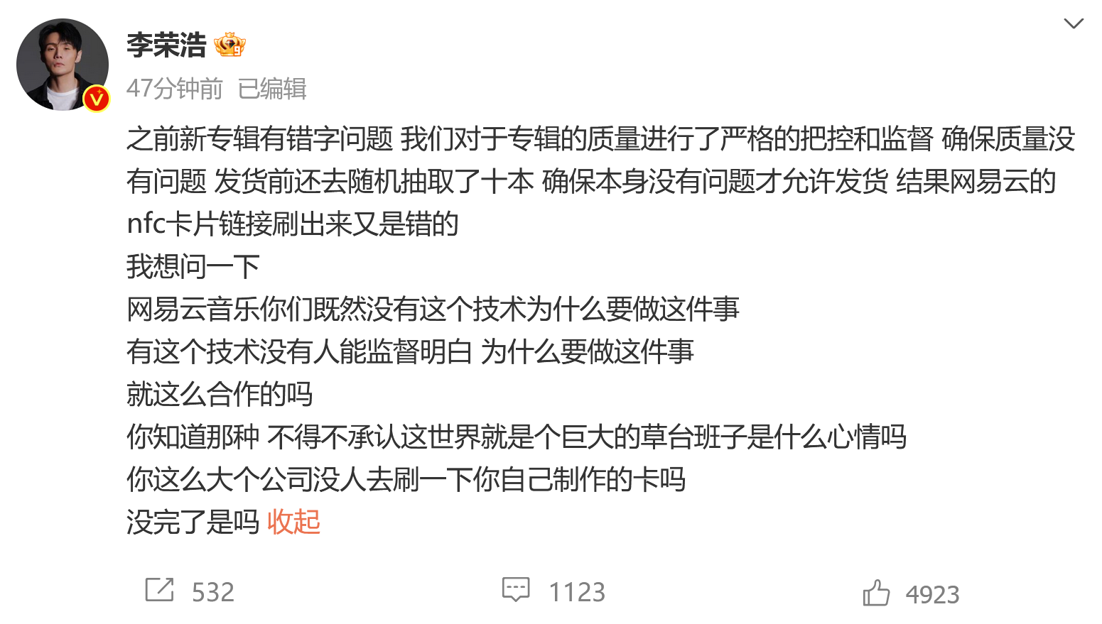 李榮浩寫道,“我想問一下,網易雲音樂你們既然沒有這個技術為什麼要做這件事?有這個技術,沒有人能監督明白,為什麼要做這件事?就這麼合作的嗎,你知道那種不得不承認這世界就是個巨大的草台班子是什麼心情嗎?你這麼大個公司沒人去刷一下你自己製作的卡嗎?沒完了是嗎?”