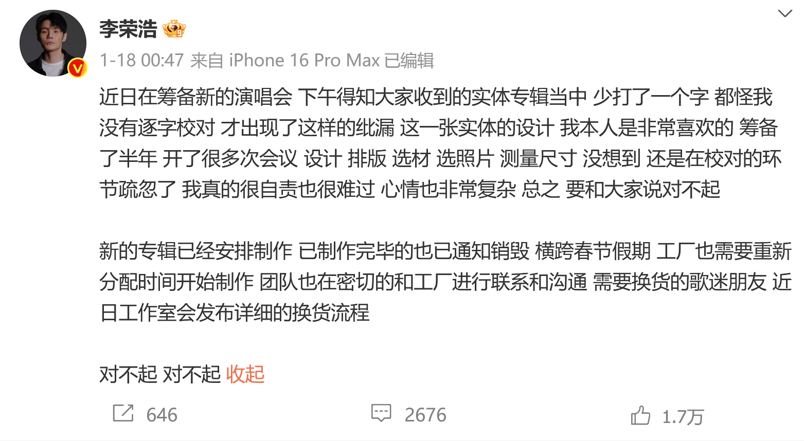 此前在1月18日,李榮浩發文説,“得知大家收到的實體專輯當中,少打了一個字,都怪我,沒有逐字校對,才出現了這樣的紕漏。”