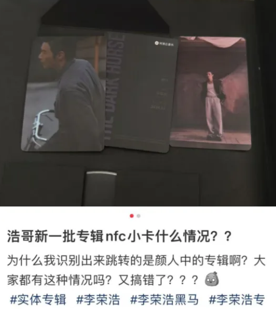 據九派新聞報道,日前有網友在社媒反映李榮浩新專輯NFC小卡,識別跳轉的是另一位歌手顏人中的專輯。
