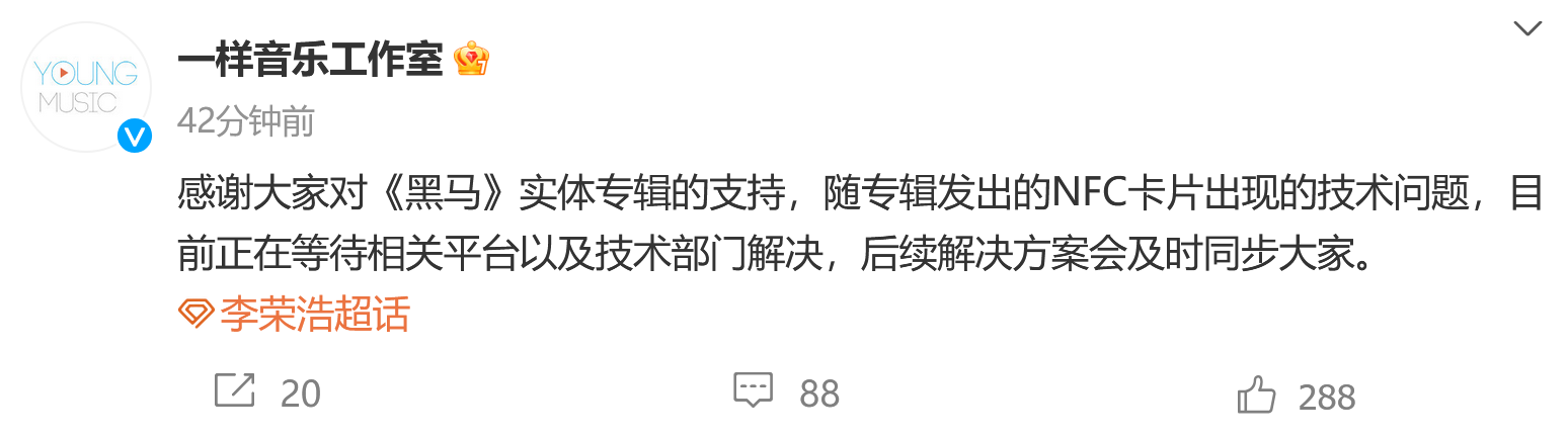 21日稍晚些,@一樣音樂工作室 發文稱:“感謝大家對《黑馬》實體專輯的支持,隨專輯發出的NFC卡片出現的技術問題,目前正在等待相關平台以及技術部門解決,後續解決方案會及時同步大家。”