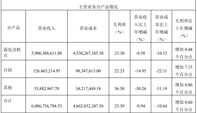 就產品類別來看,各產品的營業收入也有所下滑。其中,核心產品桃李麪包及糕點錄得營業收入59.06億元、月餅收入為1.26億元、其他產品5388.30萬元,分別較上年同期下降了9.85%、14.95%和30.26%。