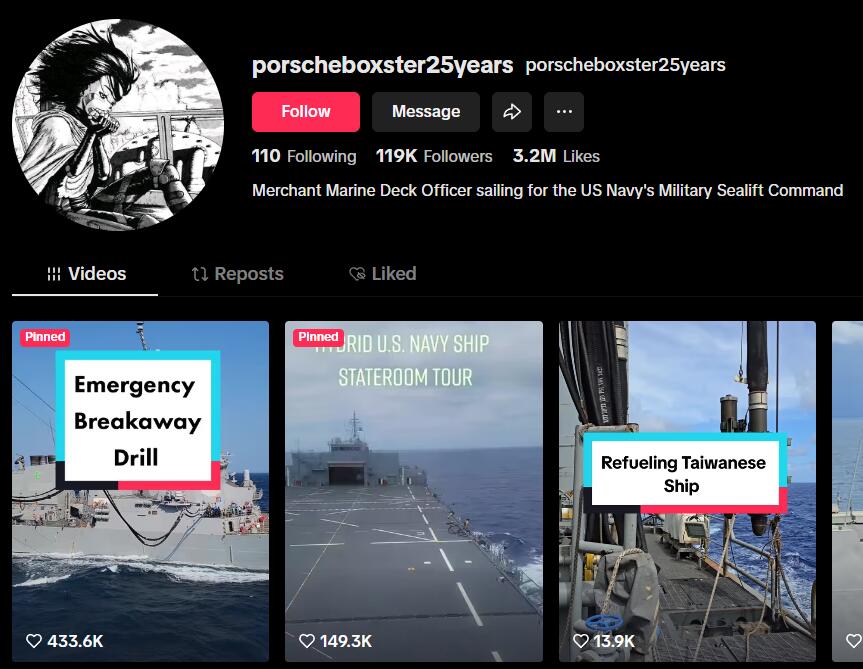 儘管美國軍方早已禁止美軍軍人使用TikTok,但以“劉易斯和克拉克”為代表的一部分後勤、支援船隻並非屬於美國海軍作戰序列而是美國軍事海運司令部管轄,其前綴也並非作戰艦艇常見的“USS”而是“USNS”,在這些船隻上,大部分負責操作、維護的並非是美國海軍現役軍人而是民間僱員,似乎也體現出美國軍方的這項禁令對民間僱員的效力確實比較有限。從他的其他視頻上來看,他還曾在同屬於美國軍事海運司令部所屬的遠征基地船上居住和工作,而他的TikTok個人簽名一欄中,也確實寫明瞭是“為美國海軍海運司令部航行的商船高級海員”這一民間僱員身份。