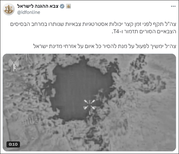 以色列國防軍發文稱對巴爾米拉機場和T4空軍基地進行了空襲。