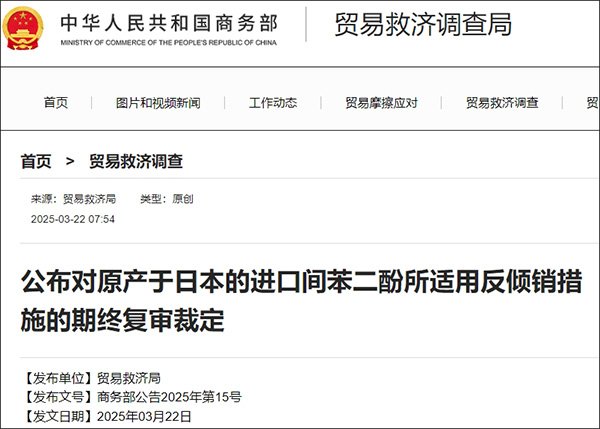 商務部網站3月22日公佈對原產於日本的進口間苯二酚所適用反傾銷措施的期終複審裁定。