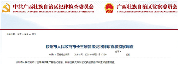 3月21日,廣西紀檢監察網發佈通報稱,欽州市人民政府市長王雄昌涉嫌嚴重違紀違法,目前正接受自治區紀委監委紀律審查和監察調查。