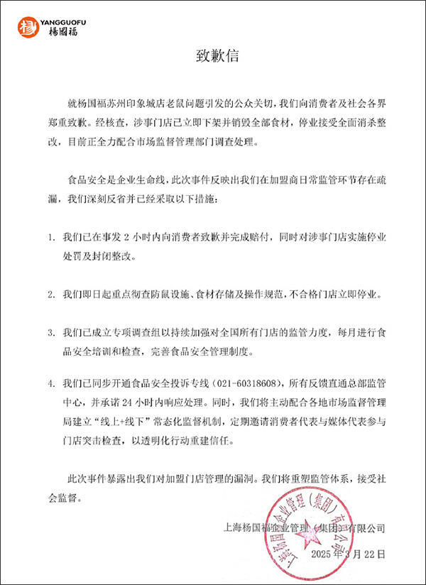 3月22日,@楊國福官方 就楊國福蘇州印象城店老鼠問題發佈道歉信稱,經核查,涉事門店已立即下架並銷燬全部食材,停業接受全面消殺整改,目前正全力配合市場監督管理部門調查處理。