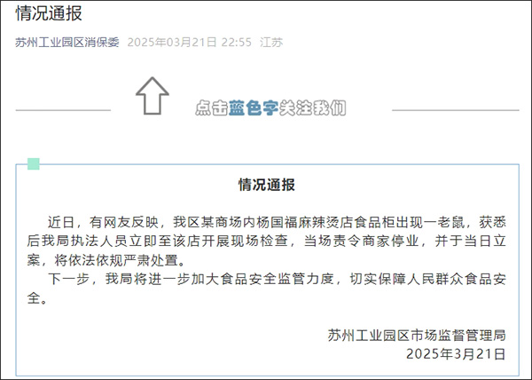 3月21日,蘇州工業園區市場監督管理局發佈情況通報稱,當場責令商家停業,並於當日立案,將依法依規嚴肅處置。