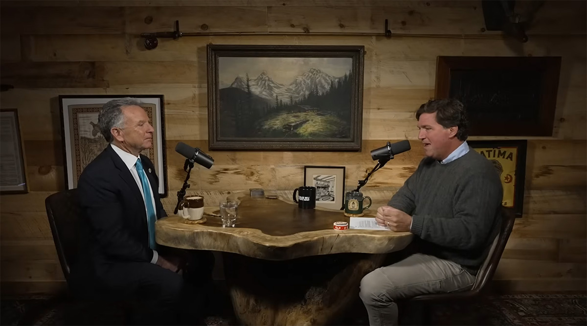 美國中東問題特使威特科夫(左)與塔克·卡爾森對話。視頻截圖