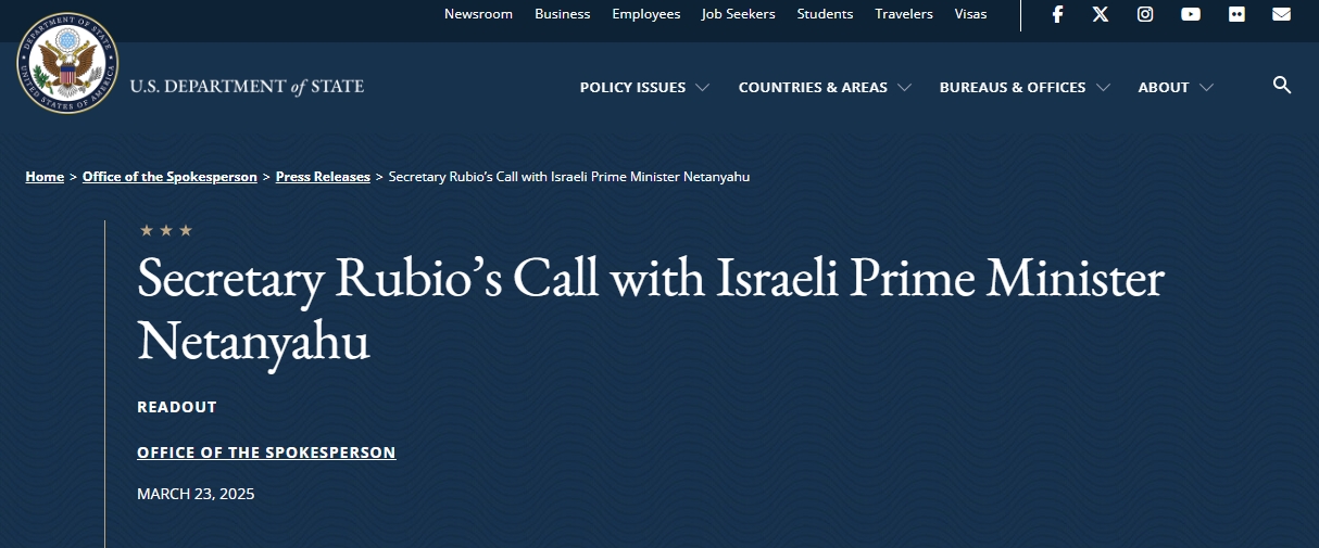 當地時間3月23日,美國國務院網站發佈聲明表示,美國國務卿魯比奧與以色列總理內塔尼亞胡通話,強調了美國對以色列的支持。