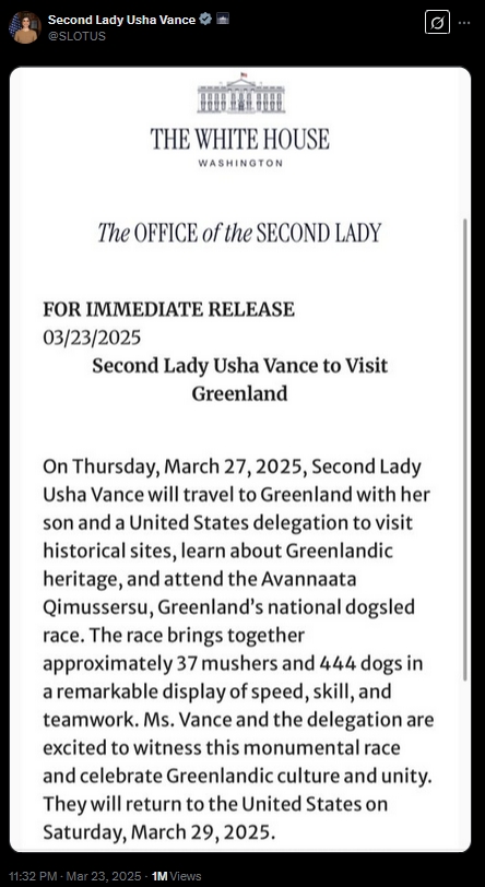 根據白宮23日發佈的聲明,在為期三天的訪問中,烏莎和兒子以及美國代表團將“參觀歷史遺蹟,瞭解格陵蘭島文化遺產”,並出席格陵蘭島一年一度的狗拉雪橇比賽。聲明稱,烏莎和代表團“很高興見證這場具有里程碑意義的比賽,並慶祝格陵蘭文化和團結”。