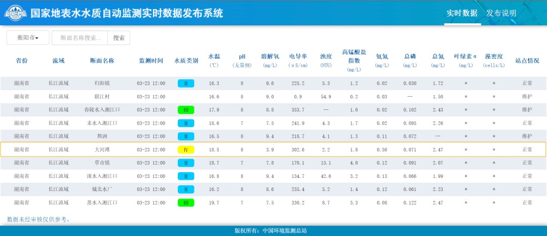 記者從國家地表水水質自動檢測即時數據發佈系統中查詢到,3月23日12:00,湖南省長江流域大河灘斷面的水質類別為“IV”,即輕度污染。