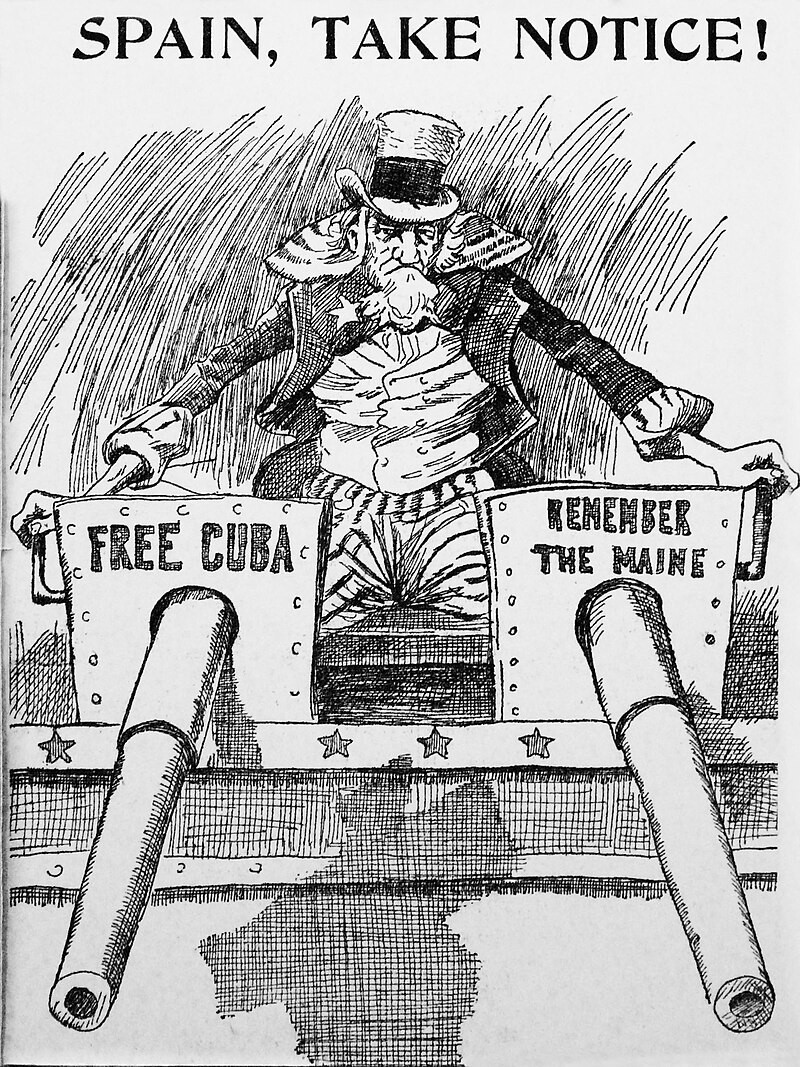 1898年,好戰的山姆大叔向西班牙發出警告的漫畫。維基百科