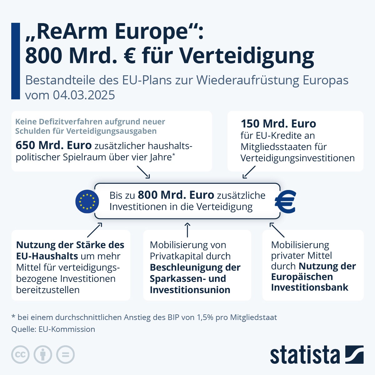 根據Statista提供的這張圖表,歐洲總共可以集資8000億歐元。如果成員國額外將其經濟產出的1.5%投資於國防,四年內共可籌到6500億歐元。而且,這部分將不受“穩定與增長公約”的舉債限制,更不會受到相應制裁。歐盟此舉無異於在鼓勵成員國借錢強軍。