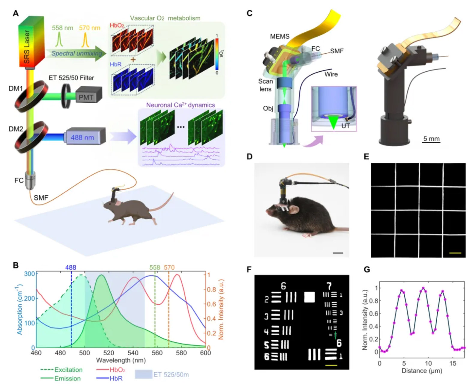(A)頭戴式光聲/熒光雙模態成像平台;(B)雙模態激發與發射光譜;(C)微型化成像探頭設計;(D)小鼠頭戴式自由活動;(E)成像視場標定,標尺:50 μm;(F-G)分辨率標定,標尺:40 μm。