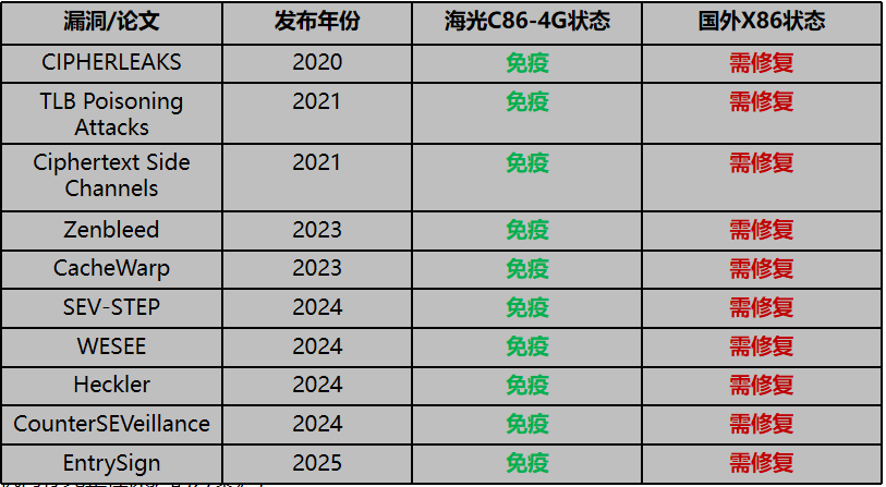 海光方面表示,對於ARM以及X86芯片所存在的漏洞,海光C86-4G處理器天然免疫。