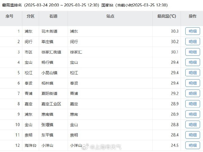 據上海市氣象局官方微博消息,25日中午徐家彙站氣温已衝破30℃,成為1933年以來最早出現30℃氣温的一年,目前位列歷史3月日最高氣温第二位!浦東、閔行也超過30℃,而且還在繼續上升中。