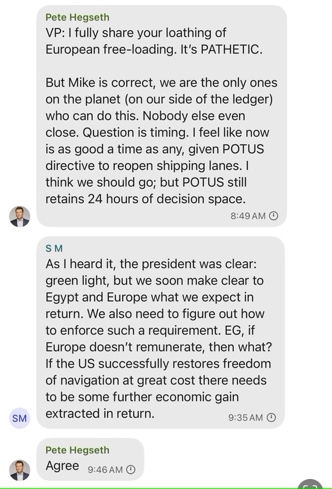 被標識為皮特·海格塞思的人在三分鐘後回應:“副總統:我對歐洲搭便車的行徑同樣深惡痛絕,這實在令人可悲。但邁克説得對,在全球範圍內(站在我們陣營的立場),我們是唯一有能力採取行動的國家,其他各方連邊都沾不上。問題在於時機選擇——鑑於總統已下令重開航道,我認為當下時機與任何時刻一樣有利。我主張立即動手,但總統仍保留24小時的最終決策窗口期。”