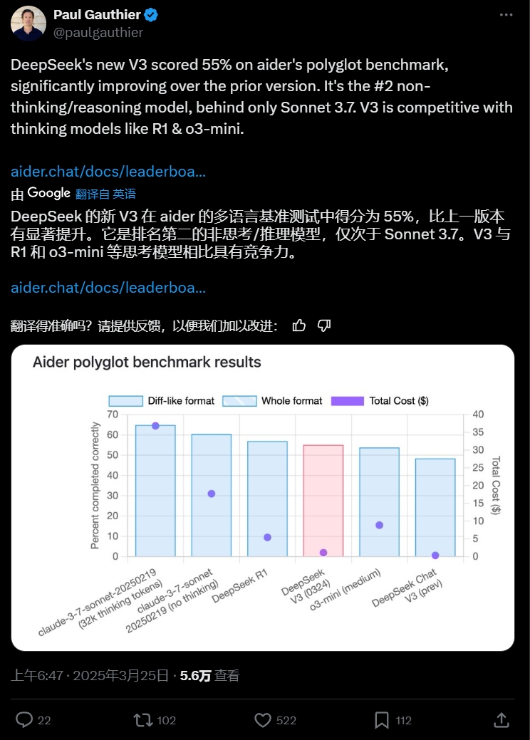 在大模型編程能力測試Aider LLM中,V3-0324的多語言基準測試得分為55%,相較於此前版本不到50%的水平有明顯進步,並且超越了OpenAI的o3-mini,接近於自家的R1,但仍然稍稍落後於以編程見長的Claude 3.7 sonnet。