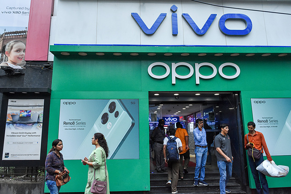 2022年7月27日,印度加爾各答,一家Oppo和Vivo商店。中國手機制造商Oppo、Vivo和小米佔據了印度智能手機市場的60%。 視覺中國