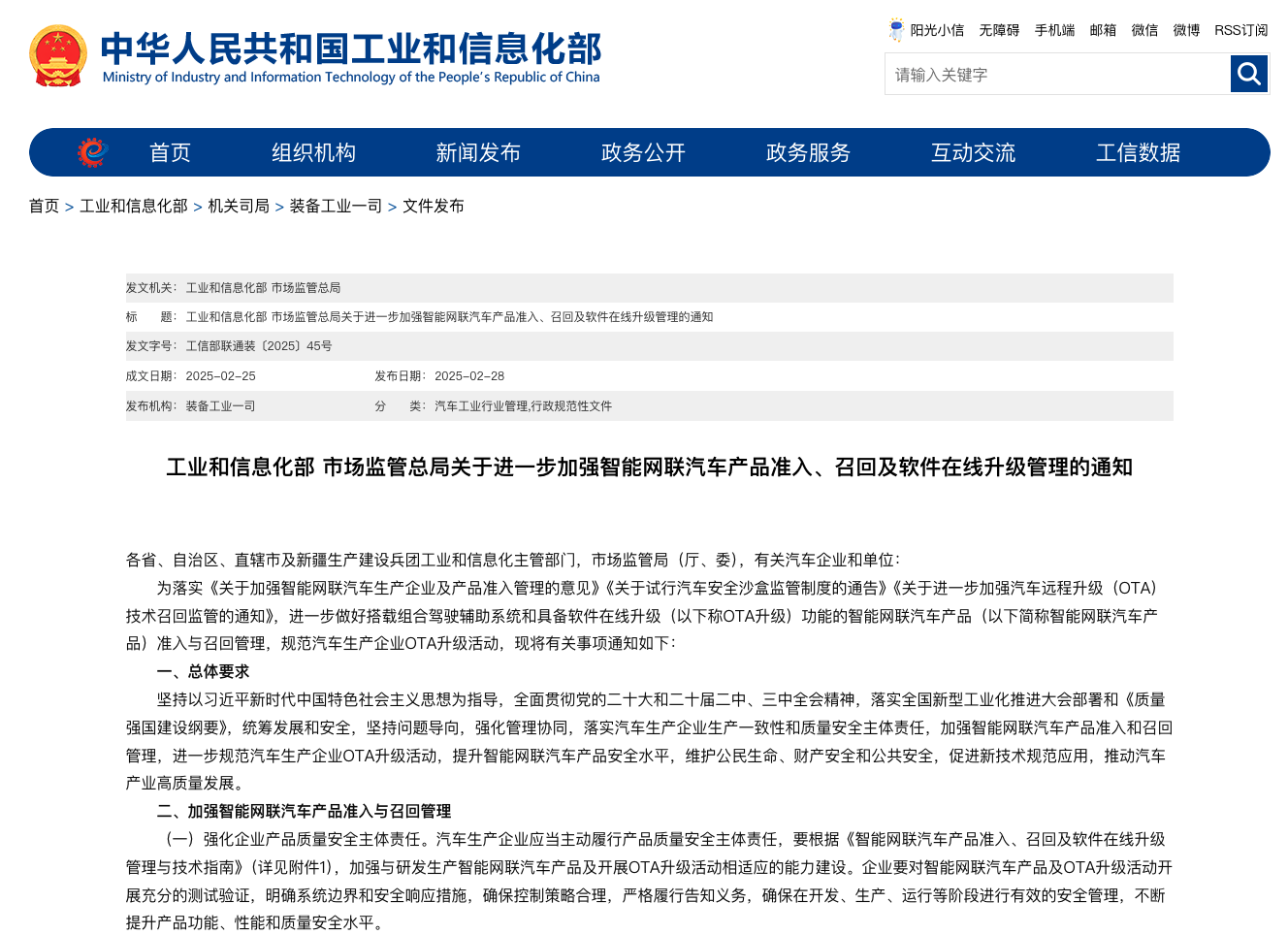 觀察者網從工信部官方網站了解到,工信部曾在2月25日發佈名為《工業和信息化部 市場監管總局關於進一步加強智能網聯汽車產品准入、召回及軟件在線升級管理的通知》(下文簡稱《通知》)。