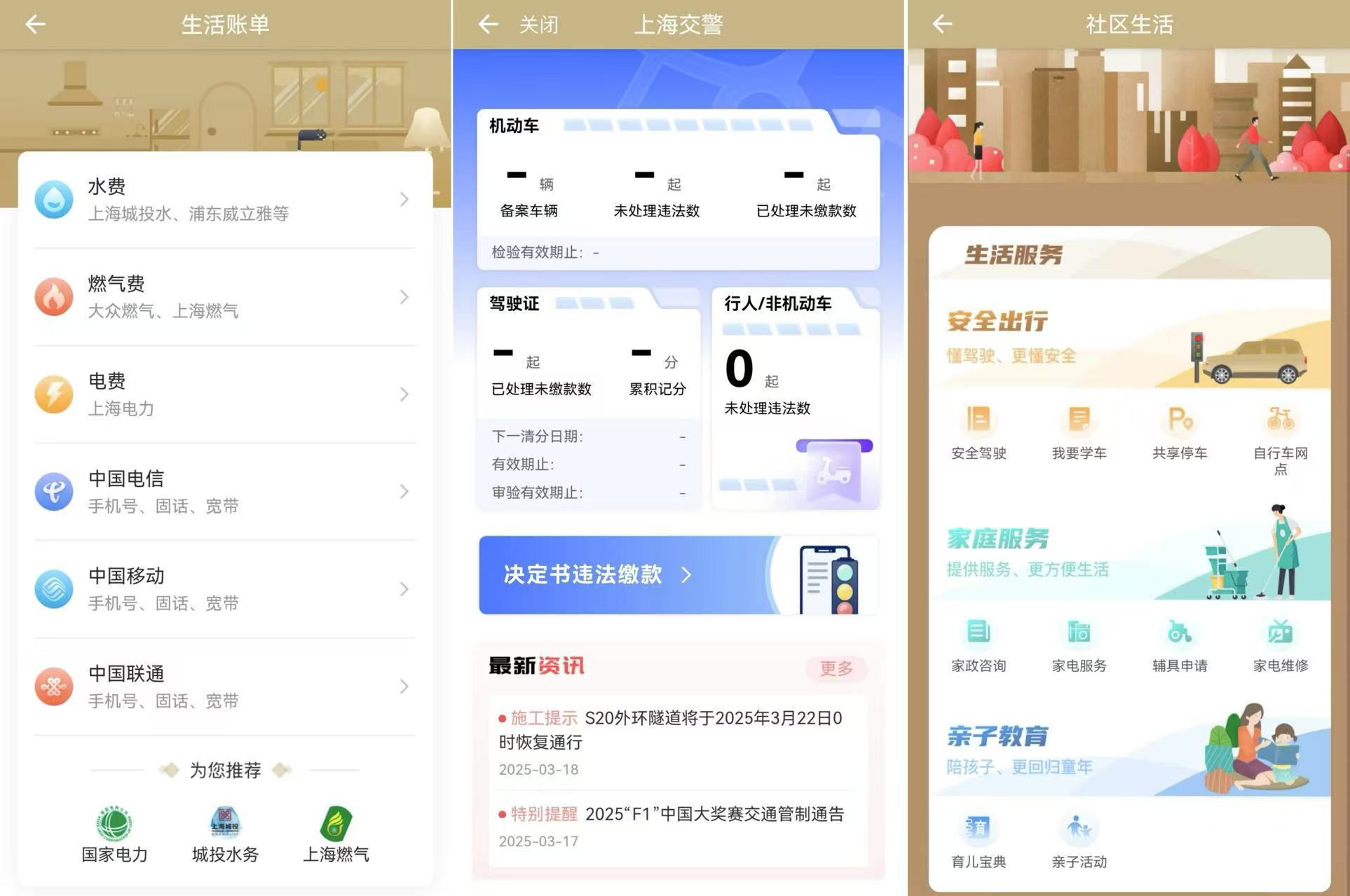 水、電、燃氣等多類生活賬單支持在線繳納和多户賬單統一管理,告別繳費跑腿,並覆蓋醫保共濟、互聯網醫院、尋醫問藥、在線掛號等各項醫療服務。除此之外,社區服務也更添温度,政務服務地圖一鍵查詢、社區活動在線預約,數字紐帶拉近鄰里距離,讓便利生活從“最後一公里”直達“家門口”。