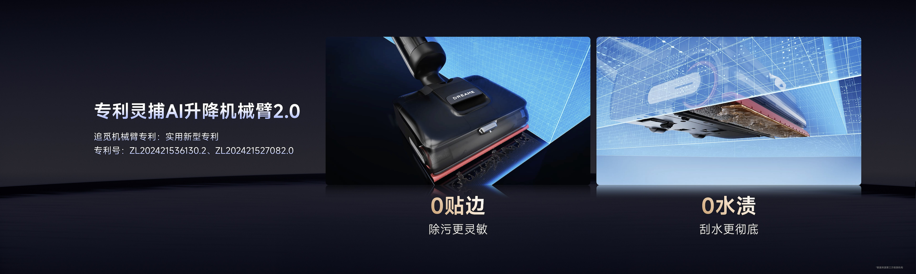 針對邊角、縫隙等深度清潔的難題,T50 Ultra洗地機搭載了追覓專利靈捕AI機械臂2.0。通過AI技術的精準感知,機械臂能夠即時發現並捕捉污漬,回拉時機械臂抵達邊緣自動下壓,迅速捕捉邊角的污漬。其微秒級的極速升降功能確保了水漬的即時清除,實現了“即擦即幹”的高效清潔,達到了真正意義上的“0 貼邊、0 水漬”的清潔標準。與1.0技術相比,靈捕AI機械臂2.0在捕捉污漬的靈敏度、刮水的穩定性以及使用壽命上都有顯著提升,徹底解決清潔死角難題。