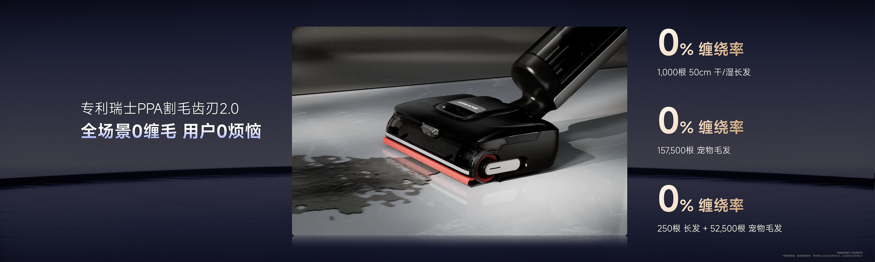 針對毛髮纏繞的挑戰,追覓T50 Ultra洗地機搭載瑞士PPA割毛齒刃2.0技術。與1.0技術相比,2.0技術顯著增強了對混合毛髮的清潔效果,不僅能高效處理人類的長髮,還專門針對家庭中常見的寵物毛髮進行了優化,包括長絨毛、短絨毛和長硬毛等,有效解決了寵物毛髮易纏繞的問題。得益於這一技術升級,無論是處理寵物毛髮還是人類毛髮,都能做到滾刷“全場景0纏毛”,真正覆蓋了家庭全毛髮清潔場景。