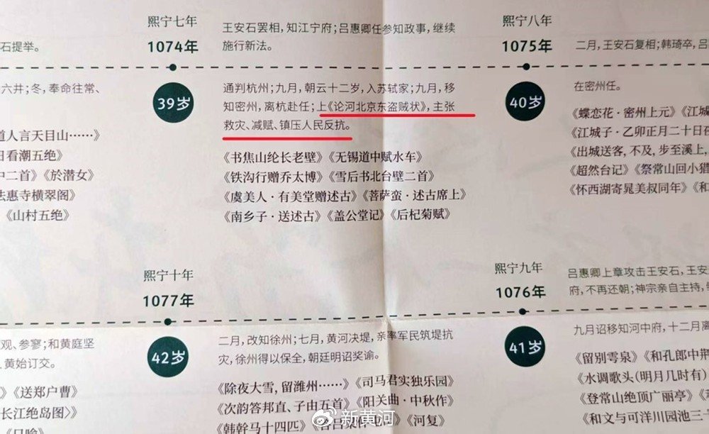 在“煕寧七年”中記有:“九月,移知密州,離杭赴任;上《論河北京東盜賊狀》,主張救災、減賦、鎮壓人民反抗。”