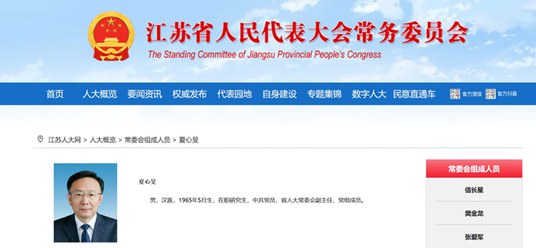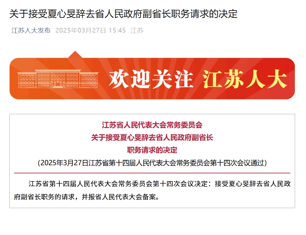 微信公眾號“江蘇人大發布”消息,3月27日,江蘇省第十四屆人民代表大會常務委員會第十四次會議通過決定:接受夏心旻辭去省人民政府副省長職務的請求,並報省人民代表大會備案。