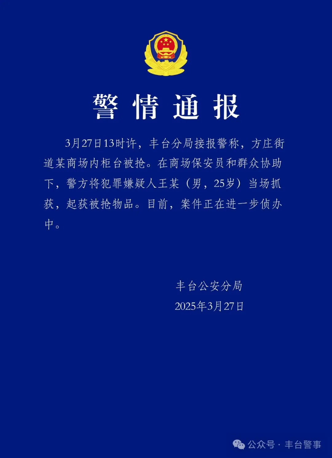 據微信公眾號“豐台警事”27日消息,北京市豐台公安分局發佈警情通報稱,方莊街道某商場內櫃枱被搶,犯罪嫌疑人王某(男,25歲)被當場抓獲。