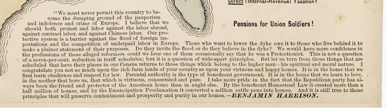 下面這段記述了哈里森的演講:“我們永遠不能允許我們國家成為歐洲的貧窮、懶惰和犯罪的垃圾場。我相信我們應該抗議並且努力防止海外勞工,反對契約勞工,反對中國勞工。我們的保護關税系統是抵抗外國進口洪流,抵抗歐洲廉價勞工競爭的屏障……”