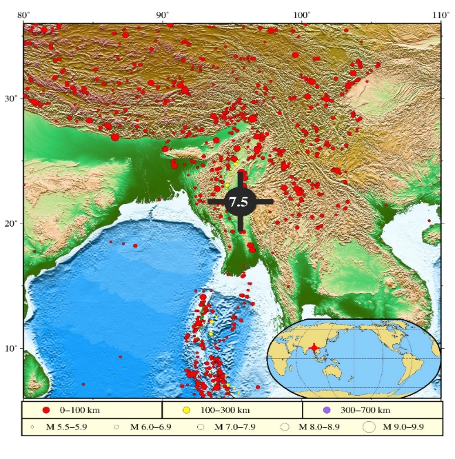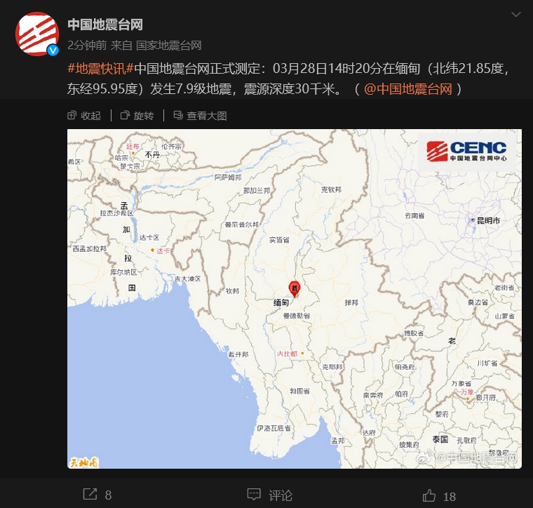 @中國地震台網 消息,中國地震台網正式測定:03月28日14時20分在緬甸(北緯21.85度,東經95.95度)發生7.9級地震,震源深度30千米。緬甸最大城市仰光震感強烈。